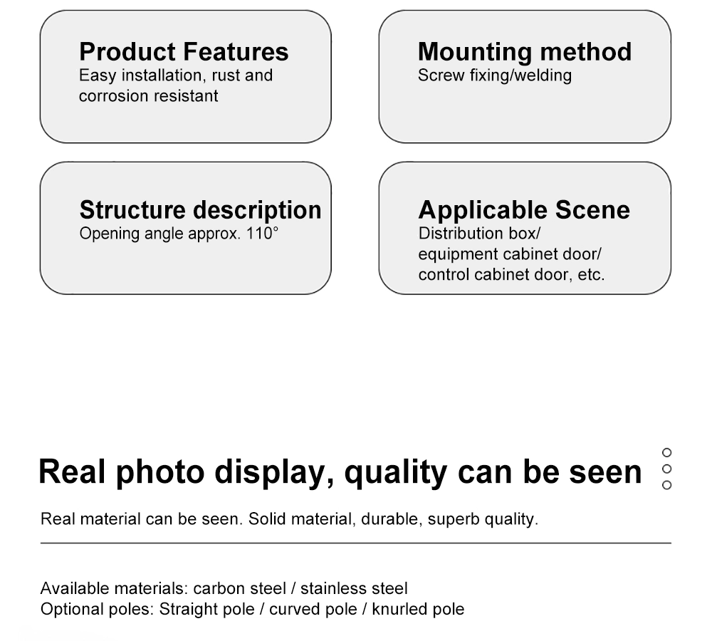 บานพับแบบหมุนของแผงจำหน่ายรองรับการยึดสกรูและการติดตั้งการเชื่อม การติดตั้งด้วยสกรูเหมาะกับตู้โลหะแผ่นมาตรฐาน ในขณะที่การเชื่อมจะใช้กับโครงที่ต้องการการวางตำแหน่งบานพับถาวร บานพับแบบหมุนของแผงกระจายสินค้า CL248 เหมาะกับกระบวนการผลิตตู้ต่างๆ และช่วยให้การติดตั้งบนตู้ไฟฟ้าและกล่องฐานมีความเสถียร